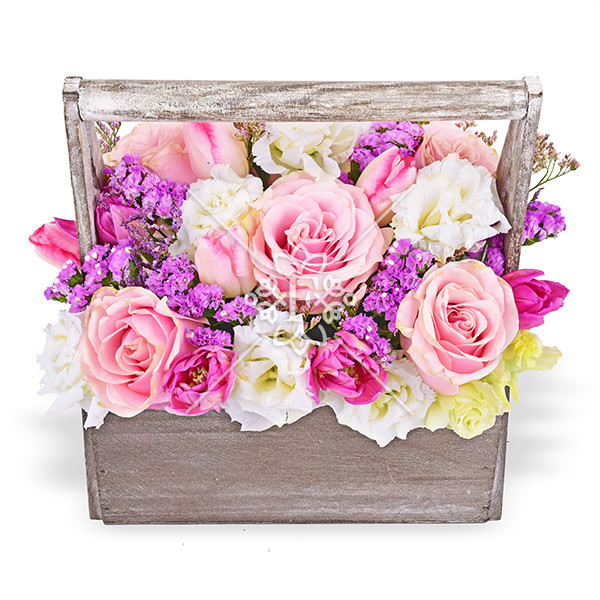 роза розовая - 6 шт., тюльпан розовый - 5 шт., эустома белая - 3 шт., тюльпан темно-розовый - 9 шт., зелень декоративная, оазис, ящик (корзинка). Примерный размер:35Х35 см.